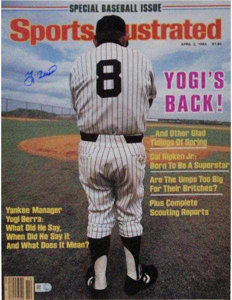 Yogi Berra Signed Sports Illustrated 11 x 14 Photo - Regarded as one of the greatest catchers in baseball history Lawrence Peter YogiBerra played 18 seasons for the New York Yankees. Throughout his illustrious playing career Berra helped the Yankees win 10 World Series Titles and was voted 18 All-Star Games. The 3-time American League MVP has his number 8 retired by the New York Yankees and was inducted to Baseball's Hall of Fame in 1972. This Yogi Berra autograph is guaranteed authentic and includes a Steiner Sports Certificate of Authenticity and an accompanying tamper-evident Steiner hologram. The Steiner Seal Means It's Real. Steiner Sports is the Official Memorabilia Partner of Yogi Berra and the New York Yankees. Specifications