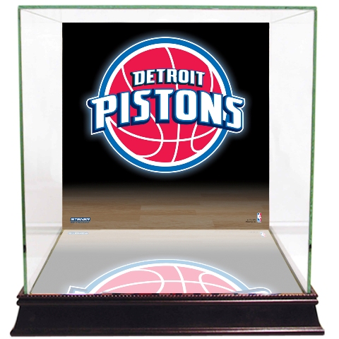 Glass Basketball Display Case with Detroit Pistons Logo Background - This customized graphic display case is a incredibly unique way to display your prized basketball. Our glass display cases are a necessity for any committed sports memorabilia enthusiast. Your timeless pieces whether autographed helmets or balls will be safe from dust and fading with our top-of-the-line exquisitely crafted cases. Each UV-protected display case is hand-made and includes a removable glass top for easy access. With a mirrored bottom and stunning cherry wood base your memorabilia will look stylish and protected in any setting. These cases are Steiner-designed and are exclusively . This case measures 12x12x11. Specifications