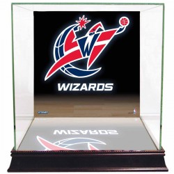 Glass Basketball Display Case with Washington Wizards Logo Background - This customized graphic display case is a incredibly unique way to display your prized basketball. Our glass display cases are a necessity for any committed sports memorabilia enthusiast. Your timeless pieces whether autographed helmets or balls will be safe from dust and fading with our top-of-the-line exquisitely crafted cases. Each UV-protected display case is hand-made and includes a removable glass top for easy access. With a mirrored bottom and stunning cherry wood base your memorabilia will look stylish and protected in any setting. These cases are Steiner-designed and are exclusively . This case measures 12x12x11. Specifications