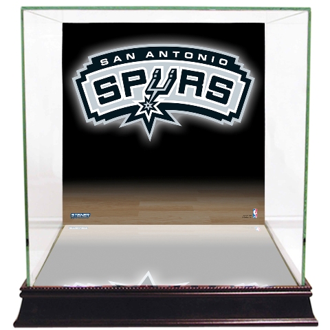 Glass Basketball Display Case with San Antonio Spurs Logo Background - This customized graphic display case is a incredibly unique way to display your prized basketball. Our glass display cases are a necessity for any committed sports memorabilia enthusiast. Your timeless pieces whether autographed helmets or balls will be safe from dust and fading with our top-of-the-line exquisitely crafted cases. Each UV-protected display case is hand-made and includes a removable glass top for easy access. With a mirrored bottom and stunning cherry wood base your memorabilia will look stylish and protected in any setting. These cases are Steiner-designed and are exclusively . This case measures 12x12x11. Specifications