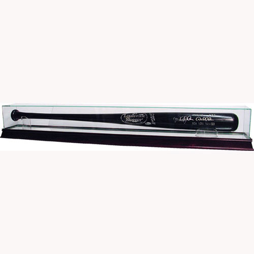 Our glass display cases are a necessity for any committed sports memorabilia enthusiast. Your timeless pieces whether autographed helmets or balls will be safe from dust and fading with our top-of-the-line exquisitely crafted cases. Each UV-protected display case is hand-made and includes a removable glass top for easy access. With a mirrored bottom and stunning cherry wood base your memorabilia will look stylish and protected in any setting. This baseball bat display case measures in overall size of: 37 inches in length with a width of 4.5 inches and a height of 5.25 inches. The available space within the case is 36 inches in length with a width and a height of 3.75 inches. We now provide special laser engraving for the glass case with your own company logo. To see a sample of this click on the smaller image above. For more information or to order a special laser engraving please call us at 1-800-759-SCORE.