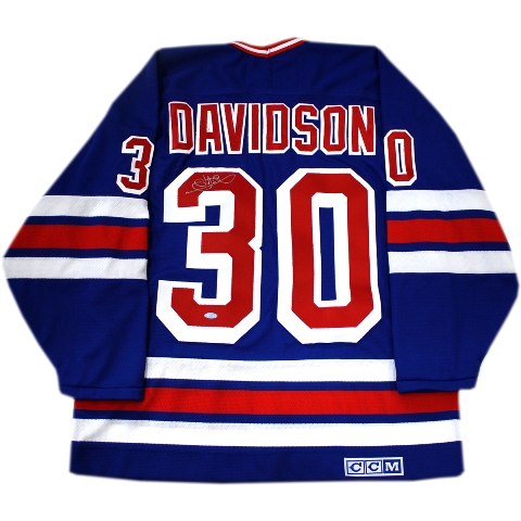 John Davidson Signed New York Rangers Throwback Jersey - Rangers' Former Goaltender John Davidson has personally hand-signed this Rangers Throwback Jersey-He is remembered as one of the Rangers players who lead the Rangers to the 1979 Stanley Cup Finals. After his retirement from the National Hockey League he went on to broadcasting Rangers games from 1986-87 and 2005-06. Along with being one of the best known Rangers goaltenders he is one of the best Hockey broadcasters there is. John Davidson was honored by the Hockey Hall of Fame with the 2009 Foster Hewitt Memorial Award for his contributions to broadcasting. This John Davidson autograph is guaranteed authentic and includes a Steiner Sports Certificate of Authenticity and an accompanying tamper-evident Steiner Hologram. Specifications