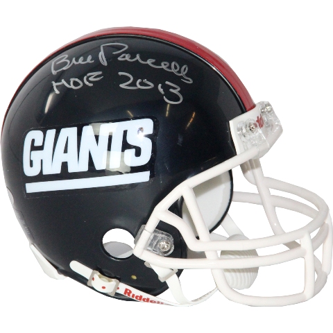 Bill Parcells Signed Giants Mini Helmet with HOF Insccribed - Bill Parcells Steiner Authenticated Autographed Mini Helmet-Coach Bill Parcells has personally hand-signed this Giants replica mini helmet and inscribed it HOF 2013. Parcells was a 2x Coach of the Year (1988 1994) and 2x Super Bowl Champion winning coach with the NY Giants (SB XXI XXV). He will forever be remembered as the original recipient of the Gatorade bath after winning SB XXI. In 2013 Parcells will be inducted into the Football Hall of Fame in Canton. This Bill Parcells autograph is guaranteed authentic and includes a Steiner Sports Certificate of Authenticity and accompanying tamper-evident Steiner Hologram. The Steiner Seal Means It's Real. Specifications