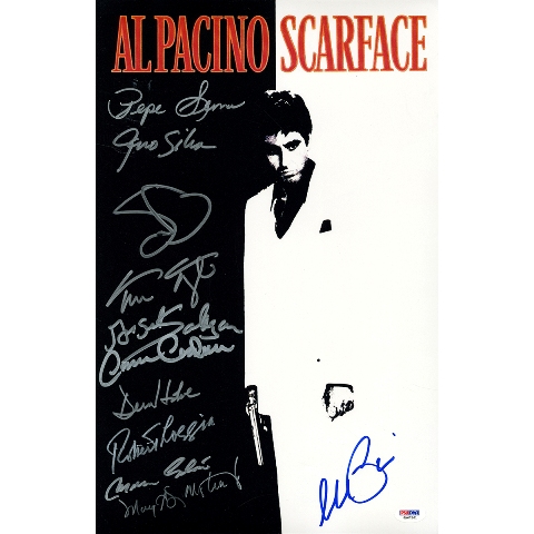 Scarface 11 x 17 Autographed Movie Poster - This 11x17 Scarface movie poster has been personally hand-signed by actors that were featured in this motion picture. Signatures on this piece: Al Pacino Pepe Serna Geno Silva Steven Bauer Dennis Holahan Angel Salazar Robert Loggia Mark Margolis Caesar Cordova Miriam Colon and Mary Elizabeth Mastrantonio. Limited Edition of 46100% Guaranteed AuthenticPSA/DNA AuthenticatedPerfect Collector's Item Specifications