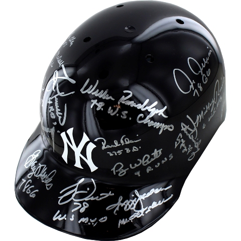 MLB 1978 Yankees 15 Signature Yankees Batting Helmet - Yankees' Multi-Signed Batting Helmet-12 New York Yankees' Greats have personally hand-signed this New York Yankees Batting Helmet. Signatures include Sparky Lyle Goose Gossage Bucky Dent Reggie Jackson Willie Randolph Mickey Rivers Chris Chambliss Roy White Graig Nettles Paul Blair Lou Piniella Larry McCall Ken Clay Dave Rajsich and Ron Guidry. The 1978 New York Yankees were one of the most memorable Yankees teams of this past century. Everything from great pitching great hitting and clashing egos the 1978 Yankees earned themselves the nickname 'The Bronx Zoo. ' Coming back from 14 games behind to the Boston Red Sox to win the American League East which lead them to win their third straight American League Pennant and a second straight World Series title are the moments that made this team memorable. There was no doubt that the 1978 New York Yankees were memorable not only for their personalities but for their perseverance and teamwork. These autographs are guaranteed authentic and include a Steiner Sports Letter of Authenticity and accompanying tamper-proof Steiner Hologram. The Steiner Seal Means It's Real. Steiner Sports is the Official Memorabilia Provider of the New York Yankees. It is also authenticated by MLB Authentication and includes a Hologram. Specifications